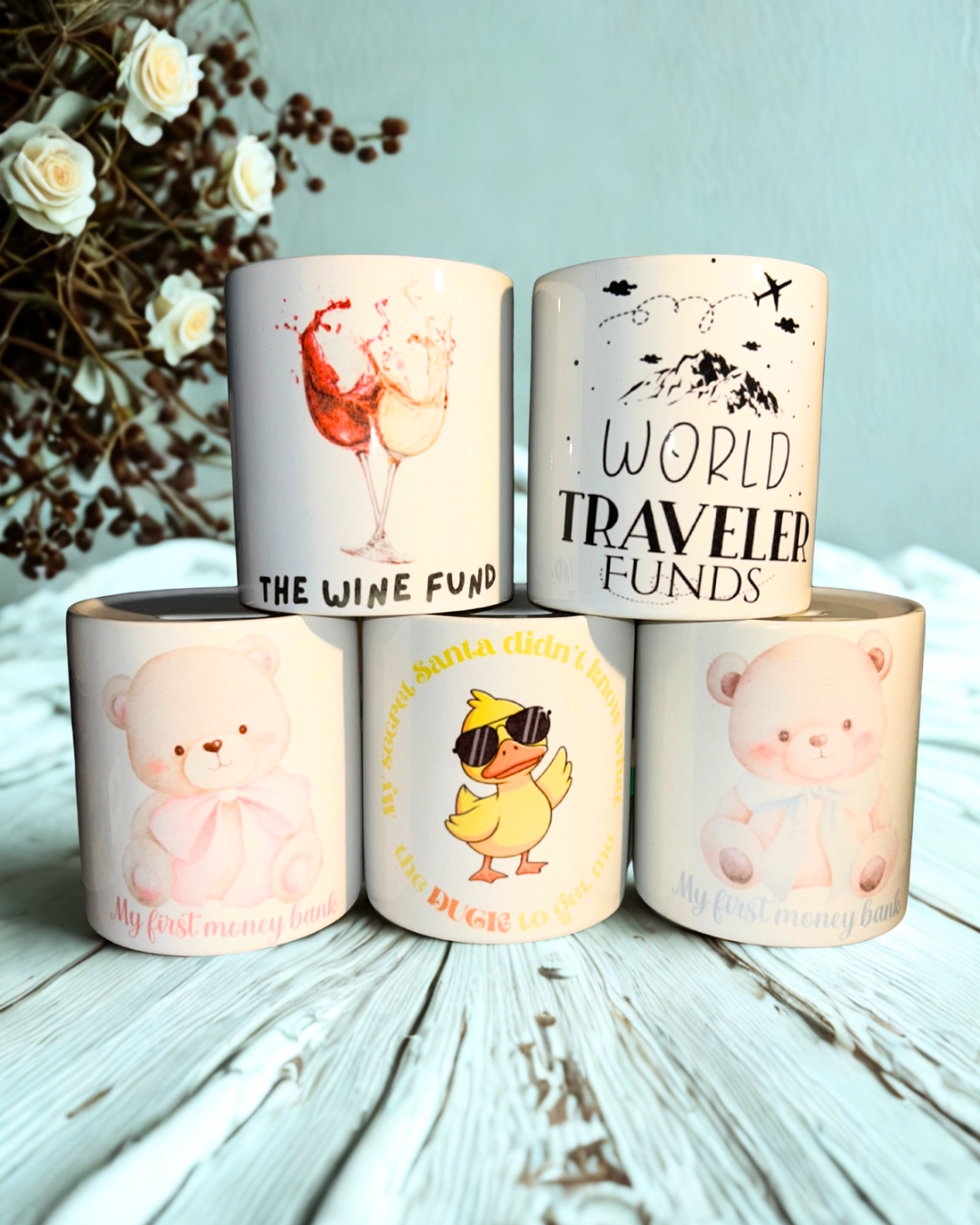 Save, spend, and store your money in style with our unique, ceramic money banks! Customize your bank with a design that suits your personality and watch your savings grow. A fun and practical way to keep your money safe.